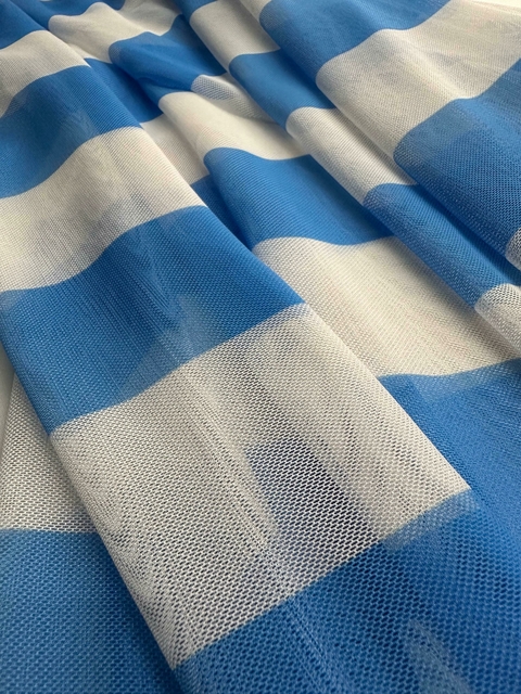 O tule de malha listrado possui um toque macio e molinho, além de ter um caimento mais pesado, com isso não arma. Ideal para confeccionar moda praiac como saídas de praia.